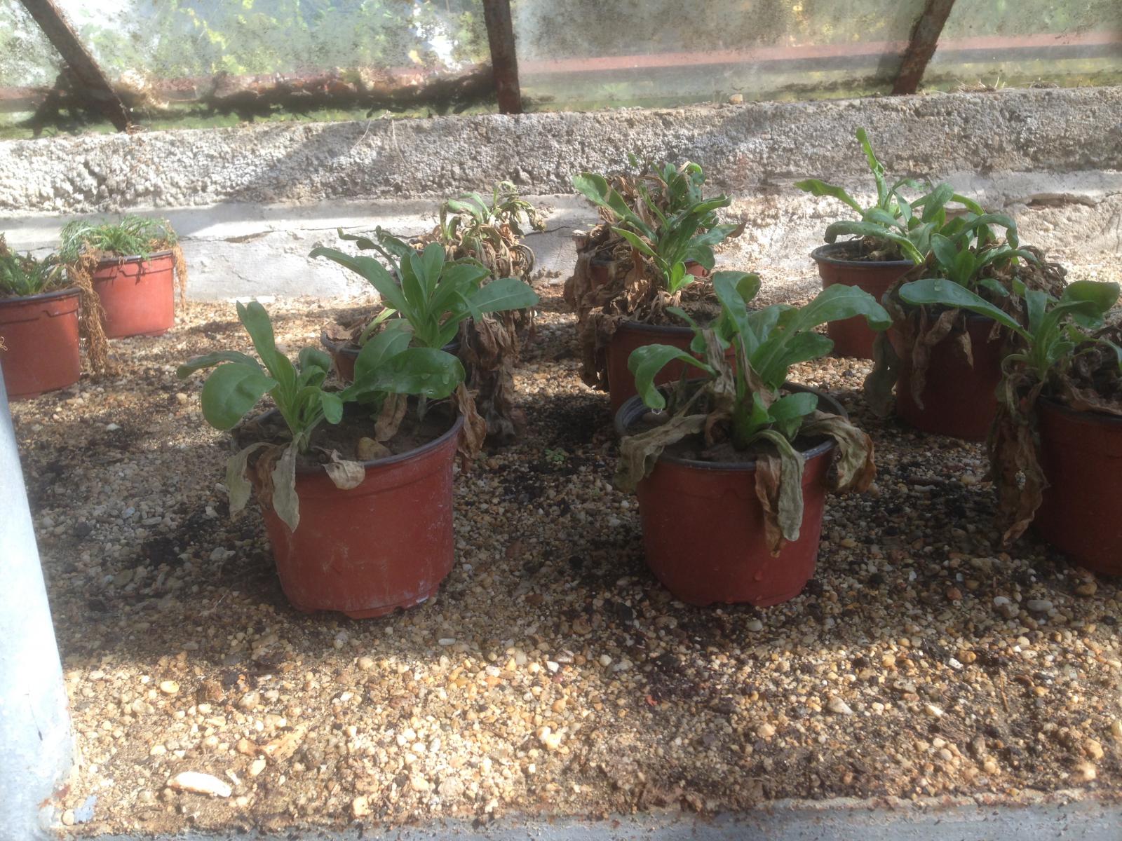 A levágott növények tövei körül még utoljára idén megforgattam a földet, a növényeket visszavágzam rövidre hogy a fagyok nem tehessenek kárt a növénybe, az optimális növényfejlődés érdekében a túlbúrjánzott részeket kiritkítottam, az üres foltokat amik egy-egy beteg tő kivétele, vagy a krup területe által még felkínált helyet kihasználva új növénnyekel ültetem be, melyekekez az üvegházban 3-4 héttel ezelőtt azanya növényekről leválasztva palántáztuk el, és most a kiültetésre alkalmassá fejlődtek. Így még lehetőség nyilik ezzen növényeknek a tél előtt a begyükeresedésre. Az üvgházban a nap melege jól felmelegíttte a növényeket, így segítve a fejlődésüket. A palántázás segítségével a következő évben még egységesebb és teljesebbé válik a krupokban termesztett növények összetétele.
